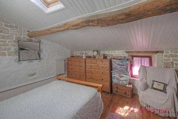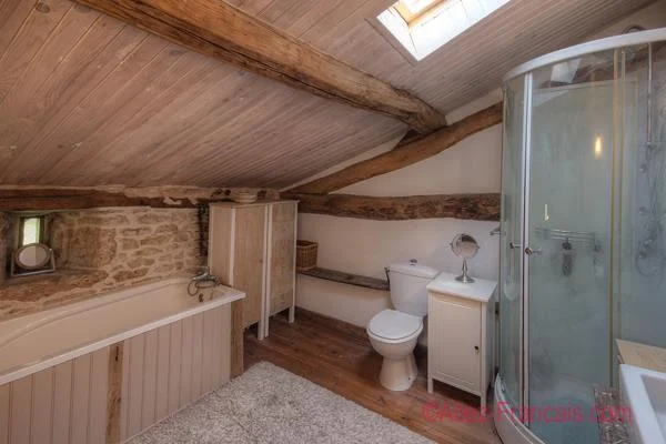 Upstairs from the kitchen is a landing with pine floor leading to a large bedroom with window to the front, velux, beams, pine floor, stone wall and wood panelling. Shower room with pine floor, velux, corner shower, vanity sink, wc and beams. The stairs in the sitting room lead to a landing area with pine floor and beams. Bedroom with 2 windows to the front, pine floor, velux and stone wall. Bathroom with pine floor, window to the rear, beams, velux, bath, shower, sink and wc.