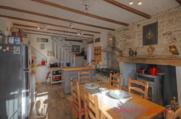 Breakfast kitchen with a tiled floor, glazed door and window to the front, window to the side, fully fitted with grey painted units, Charentaise fireplace with wood burning stove, beams, exposed stone walls, original built in cupboard, stairs upto first floor with understairs storage cupboard. Double aspect sitting room with wood floor, window and glazed door to the front, window to the rear, Charentaise fireplace with wood burning stove, beams, exposed stone walls, original stone sink with bull's eye window above and stairs upto first floor. Hall with tiled floor. Lounge with french doors and window to the front, window to the side, pellet burning stove,, exposed stone walls, beams and stairs upto a storage room/office. Bedroom with window to the side and tiled floor. Single bedroom with tiled floor and window to the side. Shower room with tiled floor, window to the rear, stone wall, wc, sink and shower. Rear hall with french doors to the rear decked and covered terrace, plumbing for washing machine and tiled floor.
