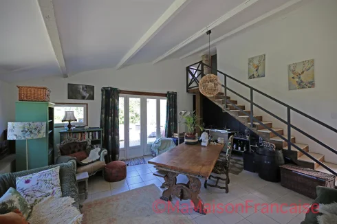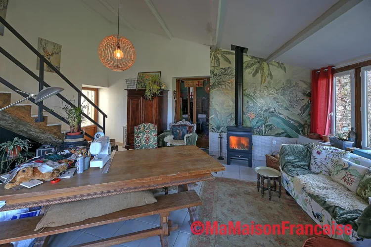 You enter the property via electric gates leading to a large gravelled driveway with parking for several vehicles. Entrance hall with tiled floor, door to side, french doors to front. Open plan living/dining room with tiled floor, Charentaise fireplace with pellet stove, glazed door to hall and 3 windows to the front overlooking the pool, exposed stone walls and beams. To the rear is the fully fitted breakfast kitchen with door to side, french doors to the rear garden with long reaching views, range cooker with cooker hood, and high ceiling with beams. Double aspect lounge with tiled floor, stairs up to first floor, small kitchen, double french doors to the rear, 3 windows to the side, wood burning stove and double height ceiling. Large living room with tiled floor, 2 windows to the side and 2 more at a higher level overlooking the pool area, high ceiling, wood burning stove and exposed stone walls. Inner hall leads to a bedroom with Charentaise fireplace, tiled floor, beams and door and window to the front overlooking the pool. Next to the bedroom is a shower room with toilet and vanity sink. Laundry room with door to side and useful separate toilet.
