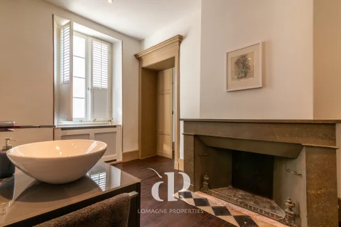 • Bedroom (32m2) - chevron style parquet flooring, decorative fireplace, door to garden, private WC.