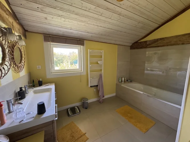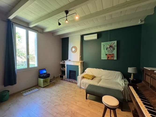 Detached stone house situated in a quiet location at Saint Aigulin, Charente Maritime. The garden is 1100m2, totally enclosed with a well. This house would suit someone loving nature, it has original features with the comfort of double glazing, a heat exchanger and a pellet burner, which is why this house has an impressive energy rating B.