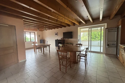 On the first floor, there is a large space comprising: a kitchen opening onto a large 50m² living room (with storage cupboards), a room with a magnificent vaulted ceiling, a shower room, and a 30m² heated veranda with breathtaking views of the plain.