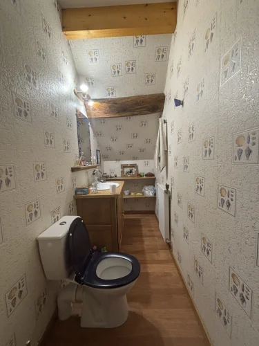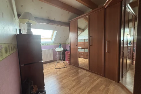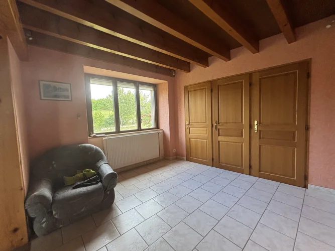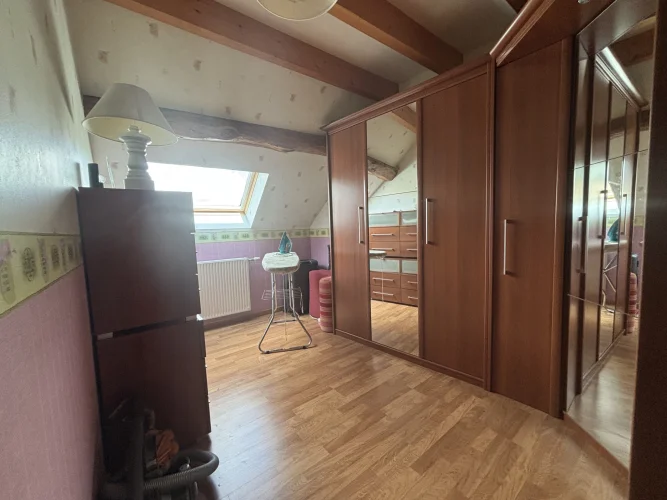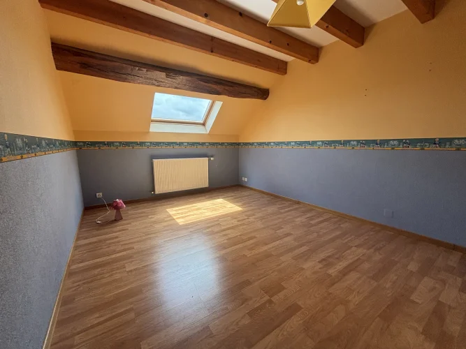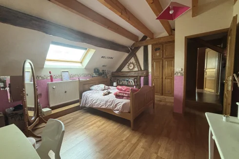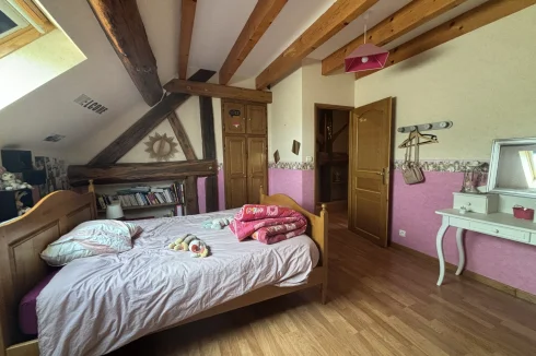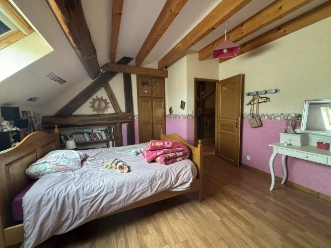 On the second floor, a landing with magnificent beams leads to three bedrooms ranging from 17m² to 20m², an 11m² dressing room, and a toilet with a sink (solid oak staircase).