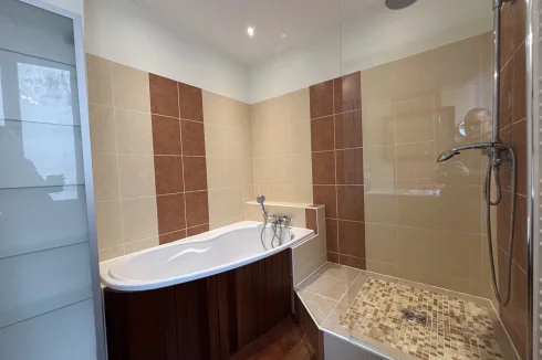 A shower room with bathtub (exotic parquet flooring) and sink, 6.34 m².