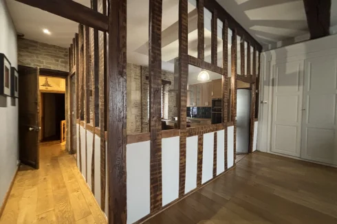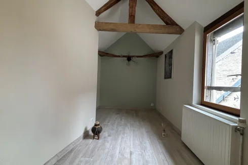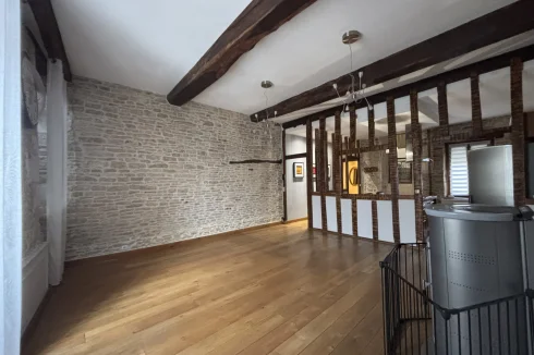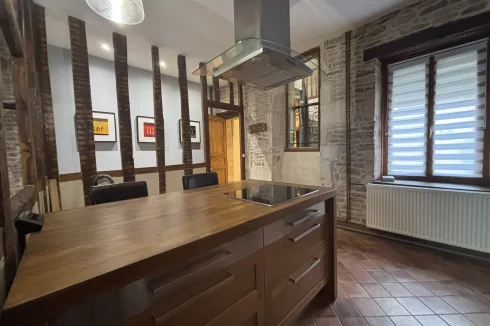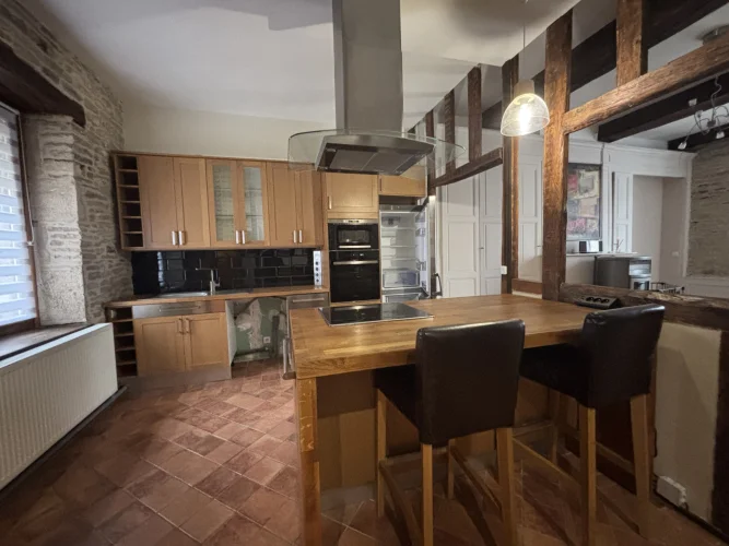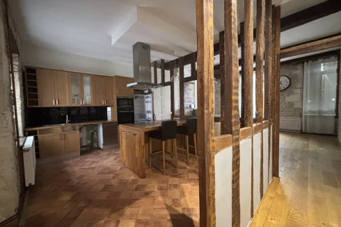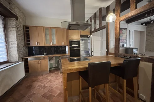 Description: The entrance is through a hallway extended by an original oak staircase, which provides access to a landing leading to a kitchen opening onto a large 47m² living room with a recent pellet stove. (8.56 m x 5.46 m).