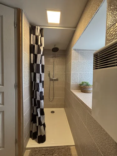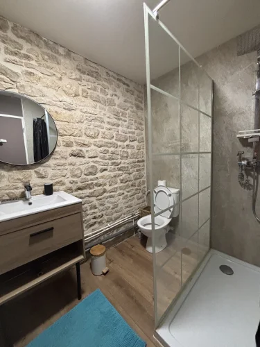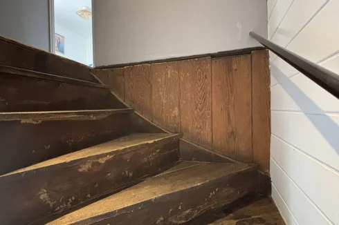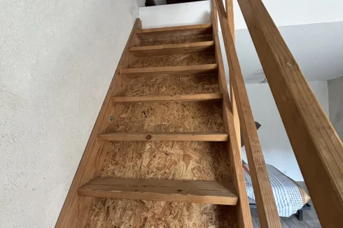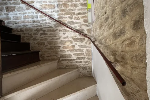 A stone staircase leads to a 27m² living room, a bathroom, and a bedroom (closets) with a toilet (surface area of 50m²) and a view of the Seine, a real 'swimming pool' in summer for the residents.