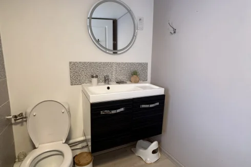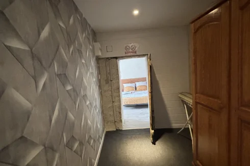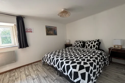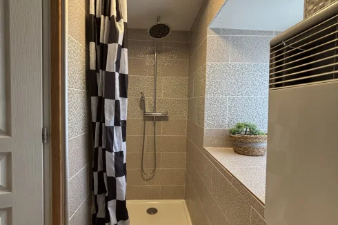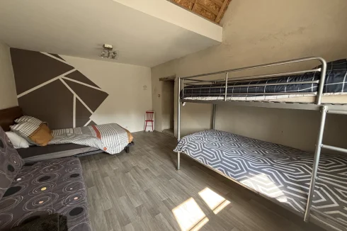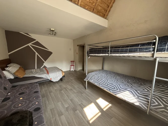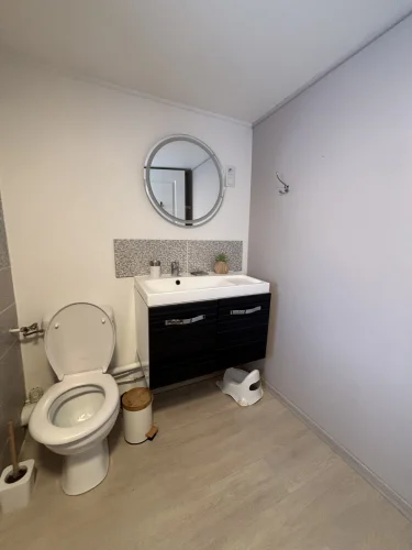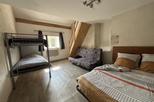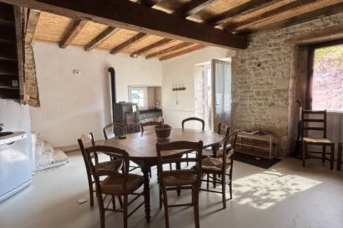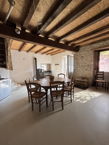 The house consists of a modern, equipped 30m² kitchen with a pellet stove (tiled floor), a spacious and bright 16.15m² living room (laminate parquet flooring).