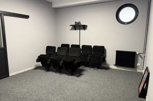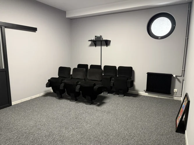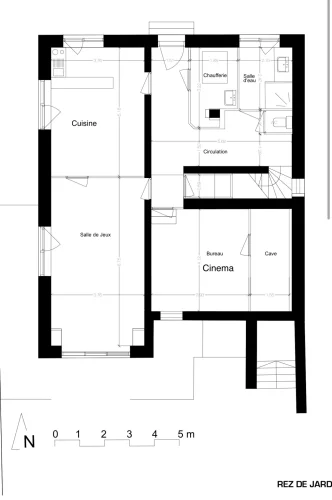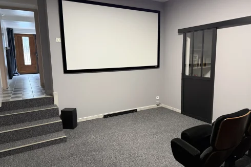 On the ground floor, a large room with a fitted kitchen, shower room, toilet, laundry room, and an adjoining cinema room with storage.