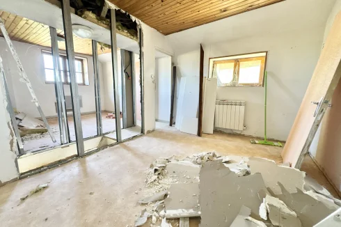Entrance to dining room, open kitchen of 21 m2 with separate WC and laundry area of 4.60 m2, bathroom with bath and shower of 4.20 m2.