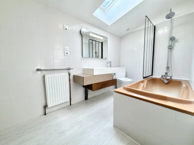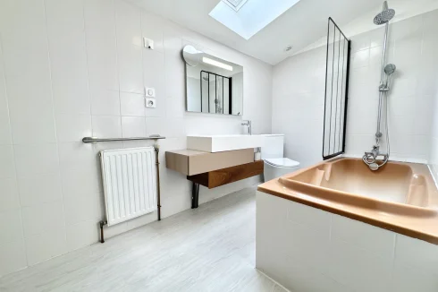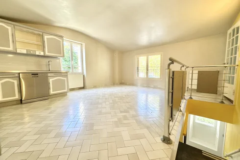 Upstairs, a large kitchen of 28 m2 with dining area, opening onto a living room of 13.70 m2, bathroom with WC of 4.05 m2.