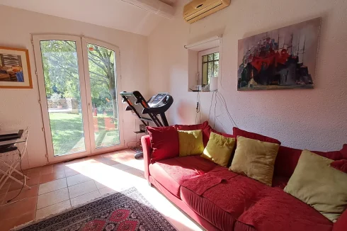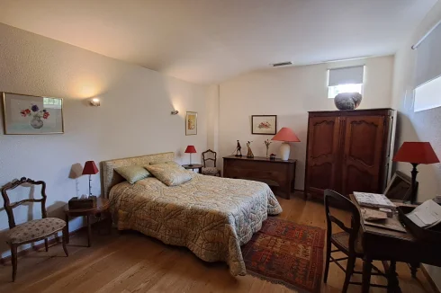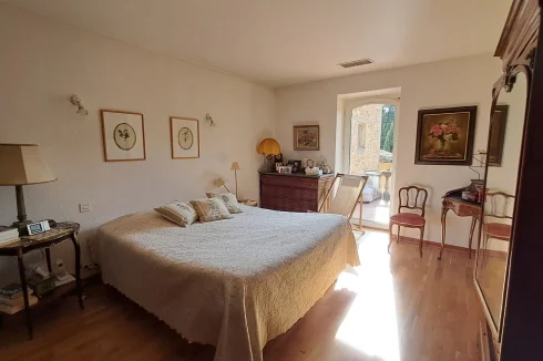 Built of stone on the southern slope of a hill, sheltered from the mistral wind, this property is located in the heart of a 9,500 m² enclosed park, secured by an electric fence. The house offers four spacious bedrooms, each with its own bathroom or shower room, as well as a spare bedroom in the attic that can also be used as a children's playroom or home theater.