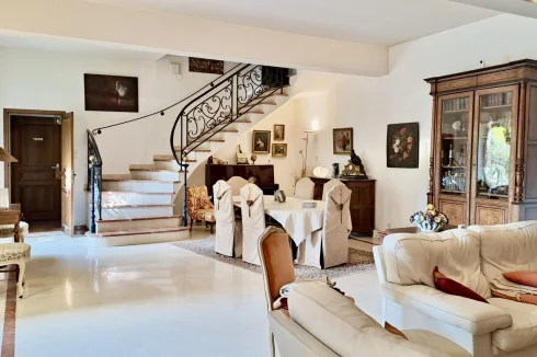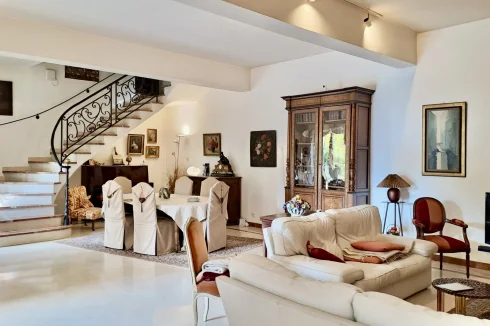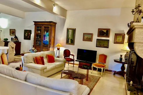 On the ground floor, a large living room with an open fireplace leads to a beautiful and bright Provençal kitchen. You will also find an office, a separate toilet and a shower room, an underground cellar ideal for storing wines, and a garage that can accommodate two vehicles.