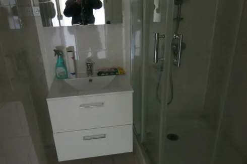 The first level features a 24m² (260 sq ft) living room and open kitchen, a shower room, a separate toilet, and a first bedroom.