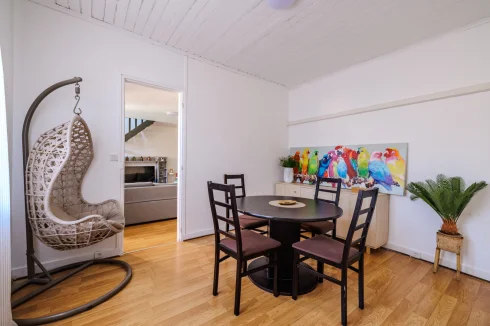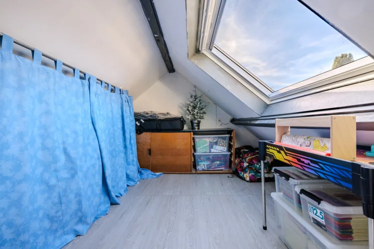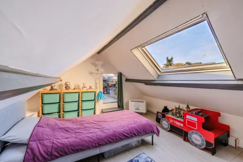 The converted attic accommodates a second bedroom and a practical storage space, which can also be used as an office or relaxation area.