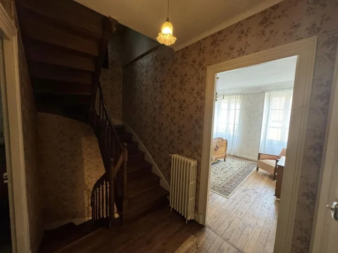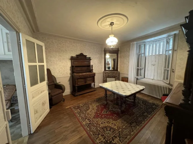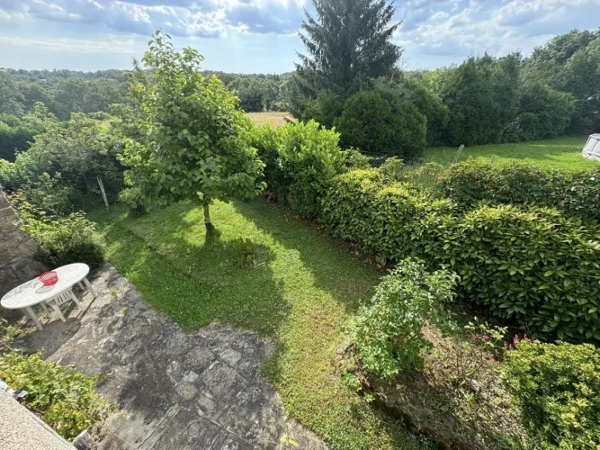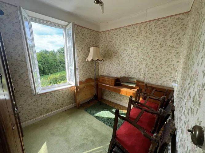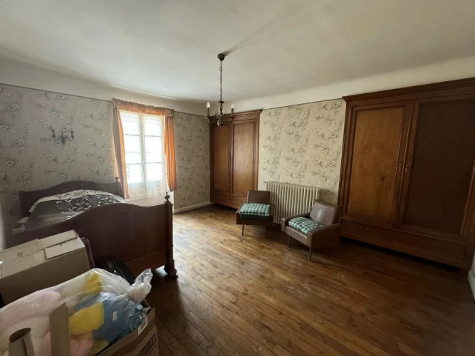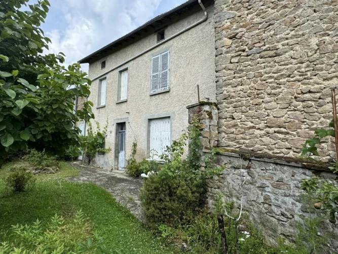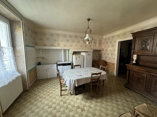 Beautiful real estate complex comprising a habitable dwelling house with adjoining barn, shelters, and garden on a plot of 277sqm, then just opposite an old uninhabitable house with adjoining barn and adjoining plots of approximately 7720 sqm. The main house on cellar comprises on the ground floor a through entrance with corridor, a kitchen, a dining room, a living room, a toilet. Old wooden stairs serve the 1st floor: landing with stairs to the attic, then 4 bedrooms and a shower room with a toilet. In the adjoining barn there is a boiler room, a barn and a garage. Heating and hot water with oil boiler installed between 1980 and 1990. A PVC window and a wooden door are double glazed, the other openings are single glazed. Mains drainage. Opposite: old house to be completely renovated with barn and courtyard, on adjoining plots of approximately 7720 sqm in the form of meadows and coppice. (7.00 % fees incl. VAT at the buyer's expense.)
