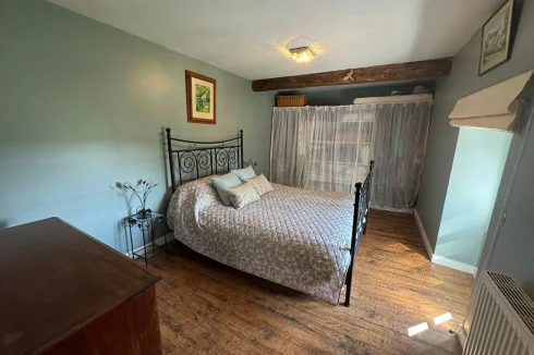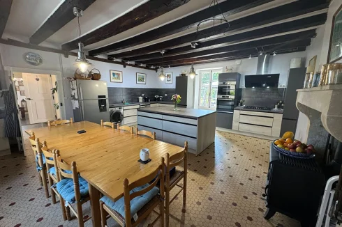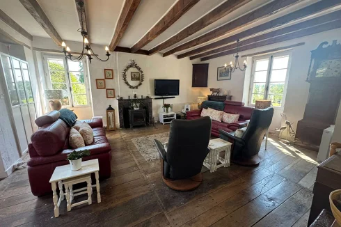 The farmhouse features a large open-plan kitchen and dining area complete with a log burner, perfect for family life and entertaining. The spacious, light-filled lounge boasts original oak flooring and another log burner, with lovely views of the meadows and terrace. The front-to-back hallway serves as an inviting passage for guests, leading out to the sun-drenched terrace.
