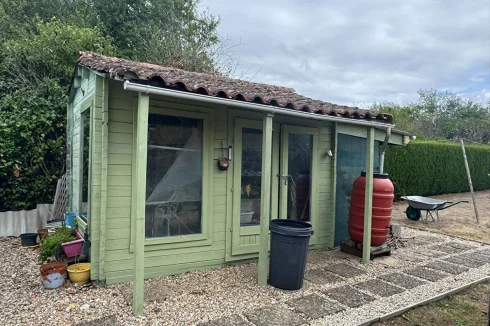 The exterior is a haven for those who love gardening and outdoor living. The landscaped lawn is planted with a variety of fruit trees, complemented by a charming garden chalet, pergola, and wood store. A gated meadow completes the grounds, offering sweeping views of the surrounding countryside.