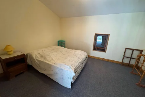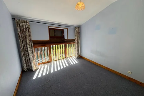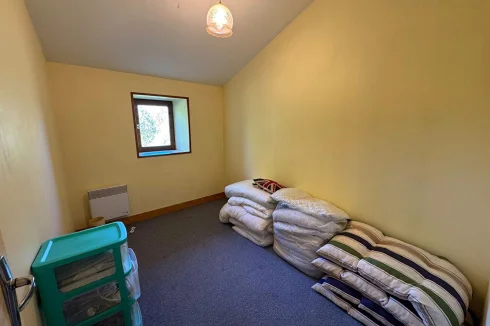 The ground floor features a spacious open-plan kitchen, dining, and living area with exposed stone walls and double glazing throughout. Heating is currently provided by electric radiators, though installing a wood or pellet burner would be straightforward. Also on this level are a WC, storage cupboard, and a shower room.