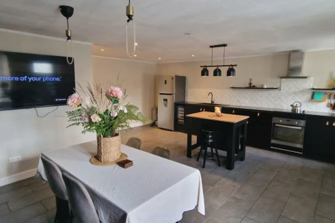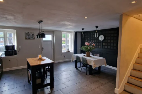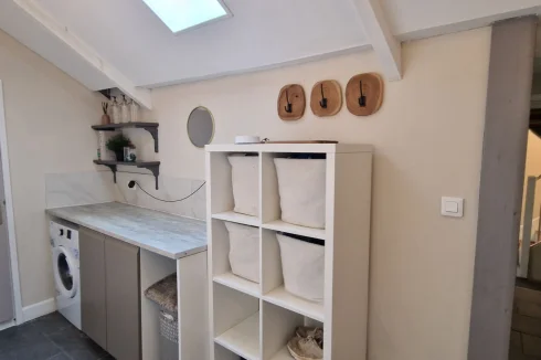 On the ground floor, there is a large modern kitchen-dining room, a laundry room, a bathroom, and a living room with an electric fireplace. (A wood-burning stove can easily be installed for cosy winter evenings.)