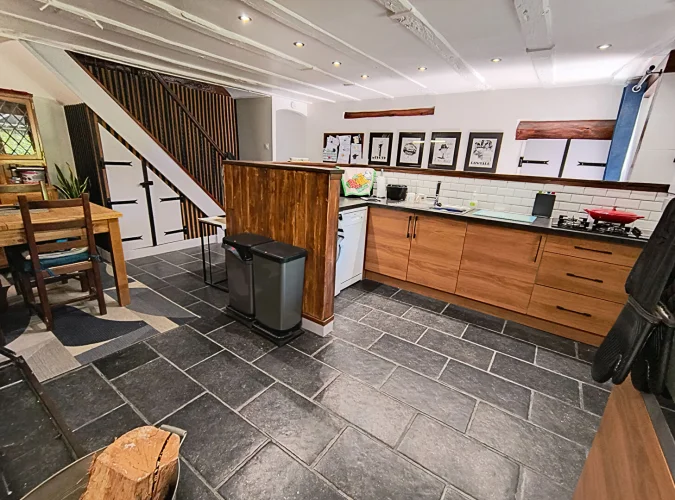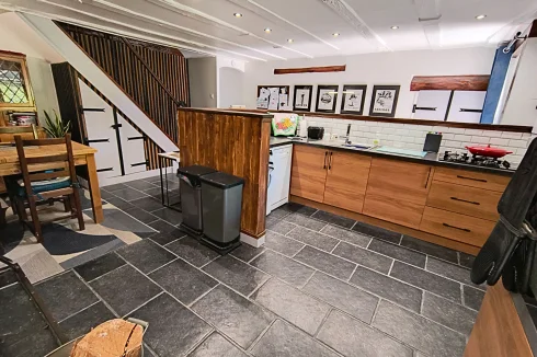 The cottage consists of on the ground floor a fully fitted kitchen and dining room with fireplace and log burner, and a separate light and airy living room.