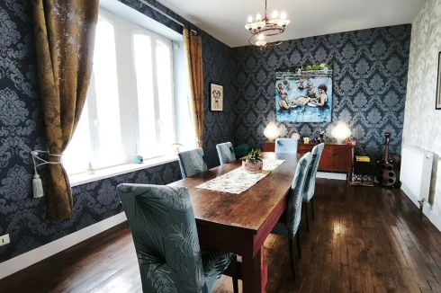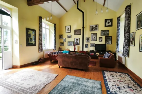 - Magnificent lounge with vaulted ceiling (approx. 50 m²) with original wooden beams, a feature wood burner, and abundant natural light.
