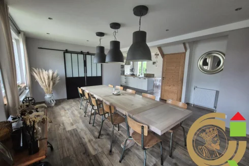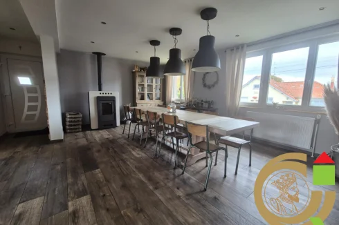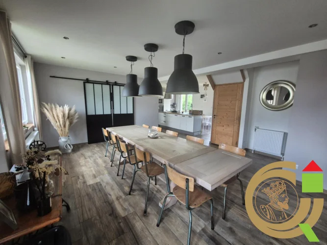 On the first floor, after climbing a few steps, you will find an entrance hall, a separate toilet, a 30.2 m² dining room, a fully equipped 16 m² kitchen with a central island, a living area with a wood-burning fireplace, a bedroom, and a bathroom.