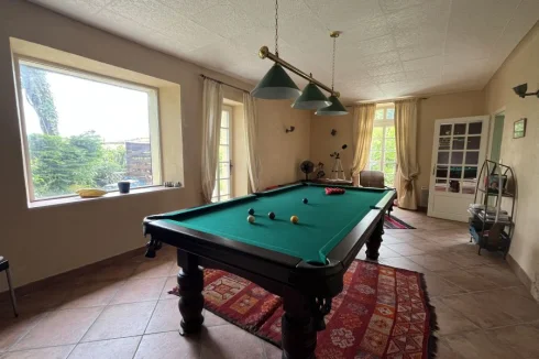 The main house, measuring 225m², offers generous proportions and a thoughtful layout designed for family living and entertaining. At its heart is a spacious open-plan kitchen, dining, and sitting room, anchored by a handsome Polyflamme fireplace and bathed in natural light. The views from the kitchen and dining section over the far reaching views are simply stunning. A second sitting room, currently used as a billiard room, provides a cosy space for relaxation or games.