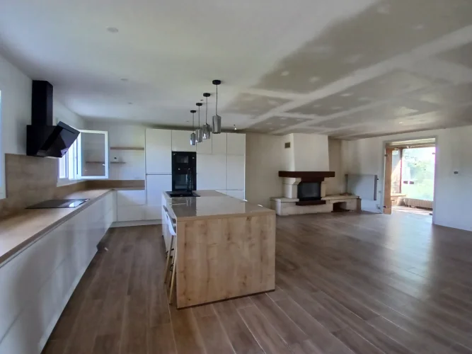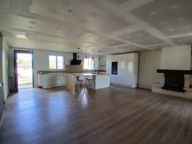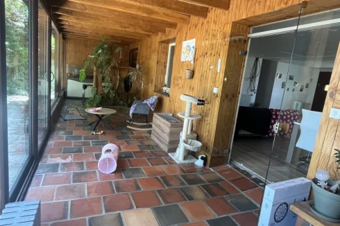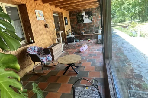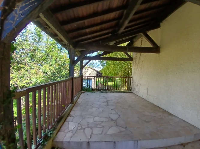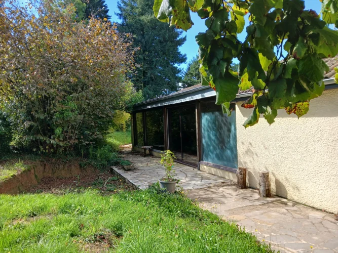 Spacious house in La Coquille for sale situated between the countryside and the town. The living space is light and spacious and flows onto the conservatory, garden and field beyond.In addition is a covered terrace to the side of the house overlooking the frontgarden.