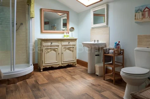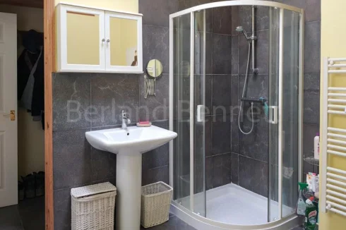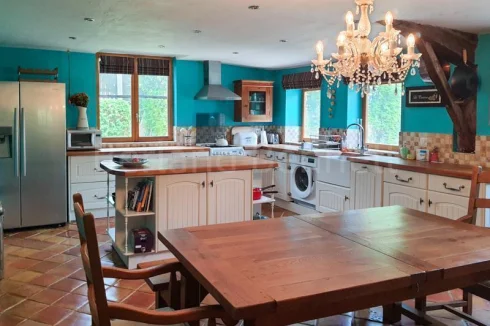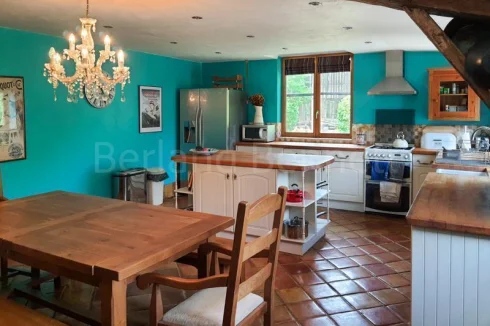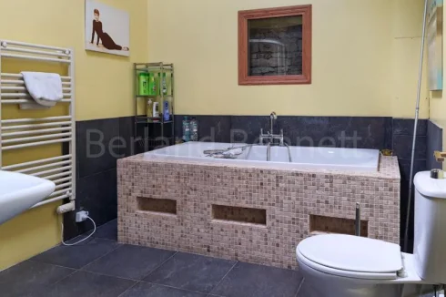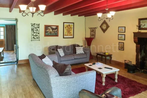 Ground floor : A generous 34 m² living room with a stunning stone fireplace and wood-burning stove, creating a warm and inviting atmosphere. A large 27 m² bedroom, also featuring a charming fireplace and wood stove – ideal for a master suite. A bright and airy 29 m² kitchen, opening directly onto the terrace and garden – perfect for entertaining family and friends.