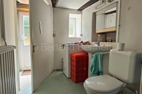 The ground floor features a cozy 24 m² living room with a characterful fireplace, a generously sized 25 m² bedroom with beautiful parquet flooring, and a bright, spacious 25 m² kitchen with a French door that opens onto the front of the house. Adjoining the kitchen, a 13.75 m² utility room provides direct access to the garden, while a shower room with a macerating WC.