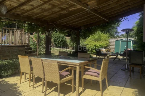 The beautifully landscaped and fully enclosed garden of 2,407 m² includes mature trees, a charming well, and an electric entrance gate for added privacy and convenience.