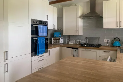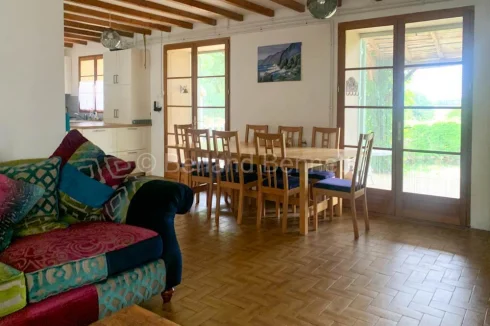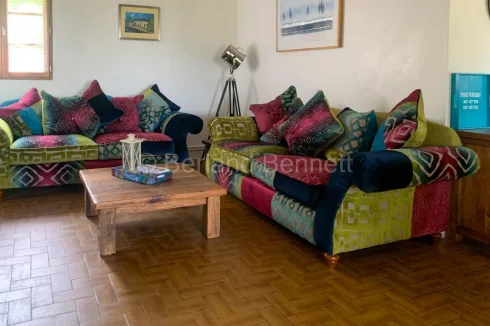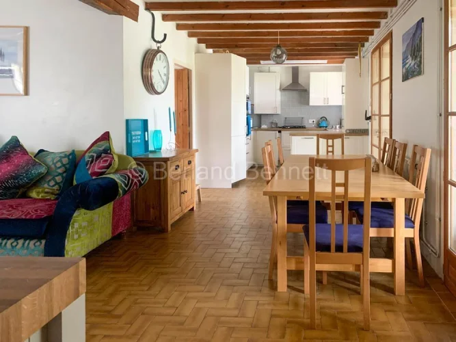Ground floor: Spacious living room of 32m2 with a wood burning fire, oak wood floor, part full height beamed ceiling, a bespoke wooden staircase leads up to a mezzanine above, double aspect windows, door to the front and French doors that flood the room with natural light and open to the rear garden. Large L shaped kitchen/dinner of 25m2, at one end a full fitted/equipped modern kitchen, the middle has space for a large dining table and a snug lounge area, the floor is tiled, the ceiling beamed, and 2 sets of French doors open to the adjoining covered terrace. Shower room with WC, a hallway has a wooden staircase and a storage cupboard and there is a bedroom of 9.5m2
