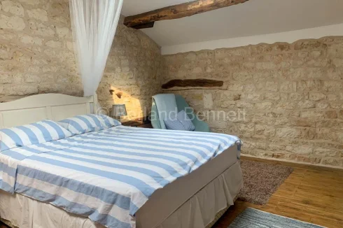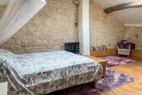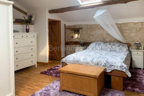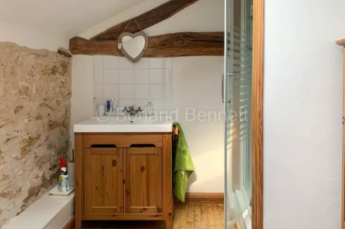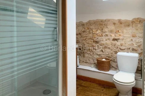 1st floor: landing, 2 pretty bedrooms of 25 + 23m3 both have wooden floors in excellent condition, exposed stone + beams add extra charm, both have en-suite shower rooms with WC's and electric towel rails. The mezzanine study/bedroom is 20m2, it has 2 velux windows, a cupboard and exposed trusses/beams.