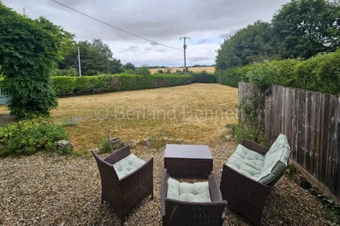 Outside there is a super covered terrace 36m2 perfect for alfresco dining/bbq etc, slightly elevated it overlooks the fully enclosed rear garden and surrounding fields. The front is South facing and has a garage with storeroom, a wooden shed, gated drive (2nd gate to the rear) and a large garden.