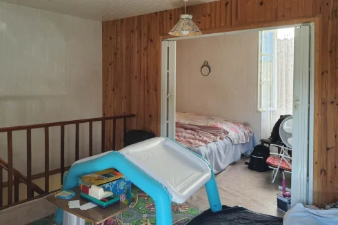 Upstairs, a generous 15m² landing currently serves as a guest bedroom with retracting doors that lead to a cozy 8.1m² main bedroom.