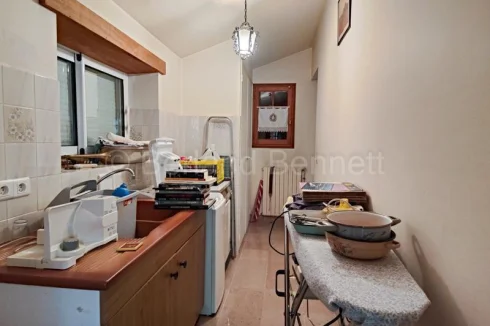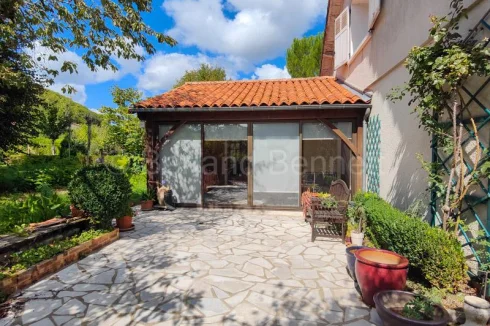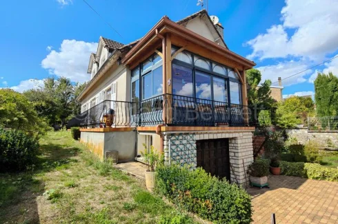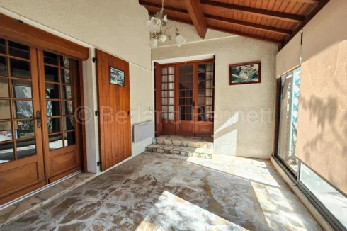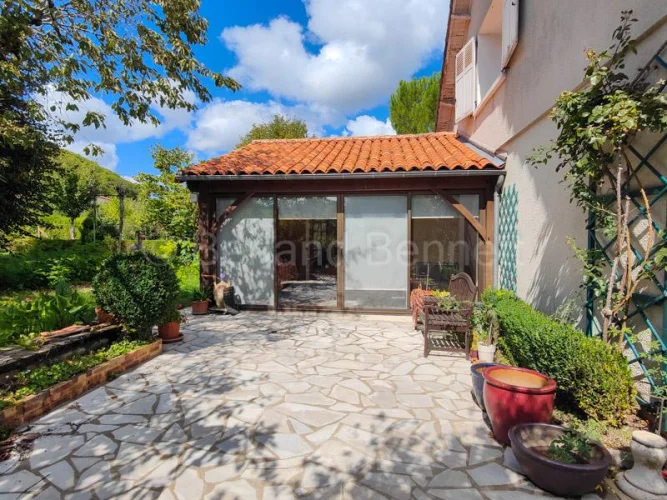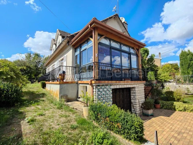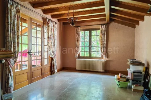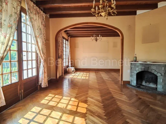 The ground floor welcomes you with an entrance hall and WC leading to a bright double living room of 32 m², beautifully enhanced by herringbone parquet flooring and large French doors, one of which opens onto a sunlit 11.65 m² veranda. The fitted kitchen of 13.70 m² has direct access to the basement, while a hallway leads to a first bedroom of almost 18 m² with French doors to the garden, a shower room, and a second bedroom of 13.30 m² opening onto a second veranda of 16.35 m². A laundry room and a 17 m² study, also connected to the conservatory.