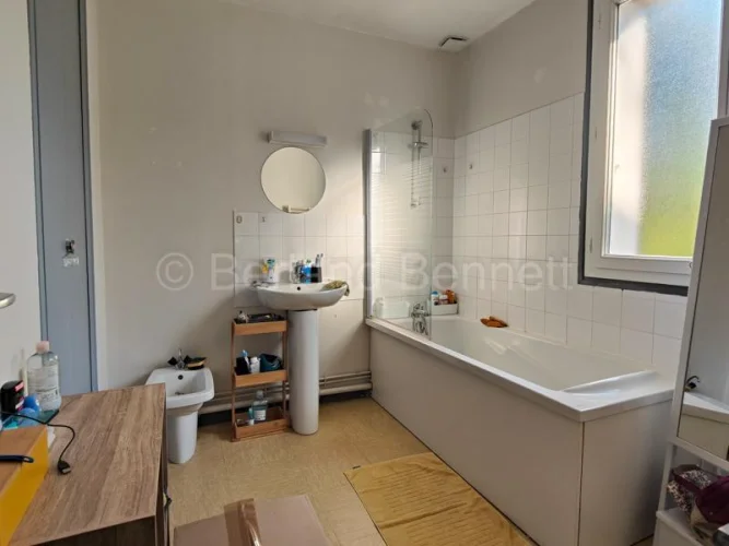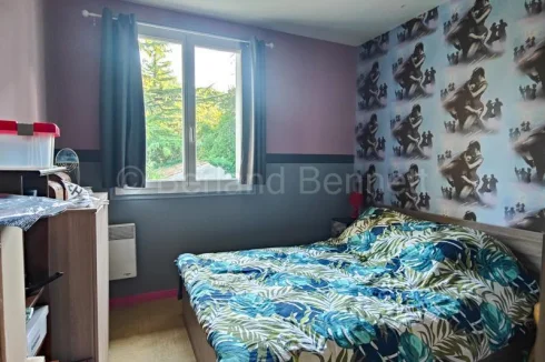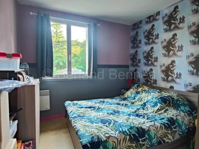 Upstairs, a landing leads to three comfortable bedrooms measuring 9.16 m², 9.20 m², and 12 m², along with a family bathroom and a separate WC. The house benefits from double-glazed PVC windows and is connected to the mains drainage system.