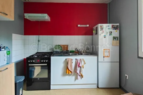 On the ground floor, the entrance opens into a bright and spacious 27.40 m² living room featuring a charming wood-burning stove and a French door that leads out to a lovely private courtyard. The fully fitted 8 m² kitchen connects directly to the 16.23 m² adjoining garage, which also includes a practical laundry area.