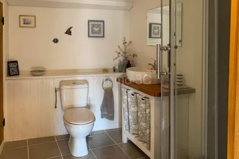 On the ground floor, a spacious 26 m² entrance hall with polished concrete flooring highlights a graceful wooden staircase. The 28.5 m² living room, complete with a fitted kitchen, an elegant stone fireplace, and a wood-burning stove, opens directly onto the enclosed garden—perfect for seamless indoor-outdoor living. Two delightful bedrooms of 20.5 m² and 15 m², one with a private shower room and WC, along with a practical utility room and an additional WC.