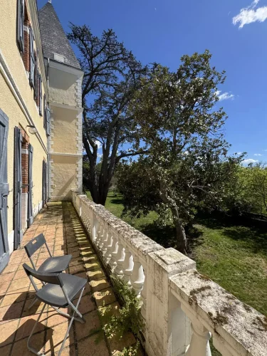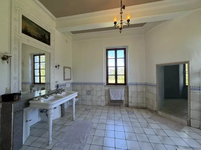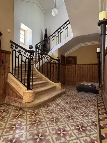 This little corner of paradise is a unique château with all its original features preserved: cement tiles, incredible paintings, an imposing stone staircase and spiral staircases, exposed stone and brickwork, plaster mouldings, door handles, and solid oak parquet flooring.