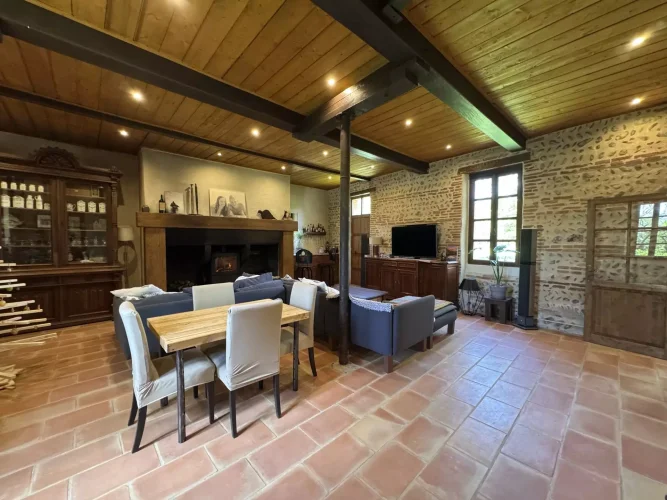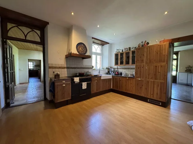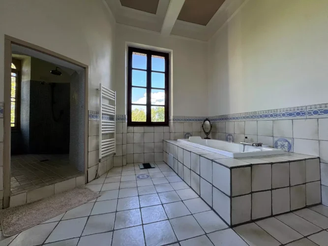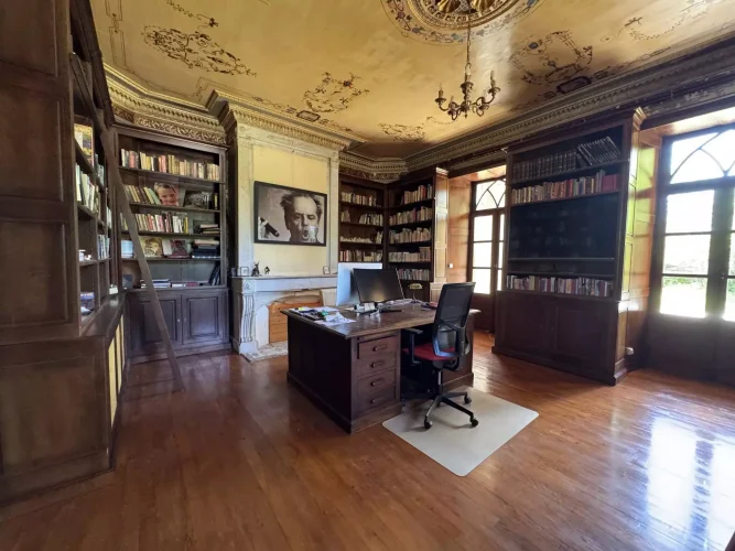 On the ground floor, there is an entrance on both sides opening onto a large hallway serving four living areas: a large library of approximately 40 sq m with a cigar humidor, fireplace, and storage overlooking the southwest round tower; a 30 sq m living room with a wood-burning stove and storage overlooking the southeast square tower; a dining room of approximately 25 sq m opening onto a back kitchen in the northeast round tower; a kitchen of approximately 25 sq m; and a large open-plan living/dining room of approximately 50 sq m with a wood-burning stove and a separate entrance, as well as a pantry and a WC.