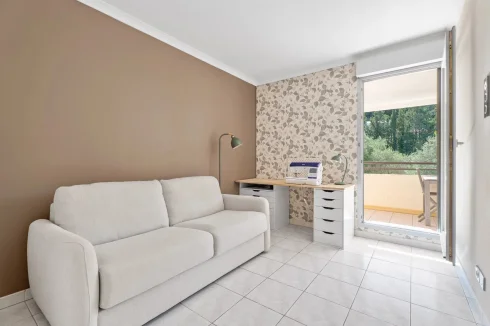 In a small, well-maintained residential building withing walking distance to shops, come and discover this cozy 3-room apartment.It features an entrance hall with built-in storage, a bright living and dining area with an open-plan, fully equipped kitchen in a contemporary style. The sleeping area offers two bedrooms with built-in wardrobes. All rooms open onto a stunning 27 sqm terrace, perfectly oriented, completely private, and absolutely quiet. A private garage adds to the comfort of this property.