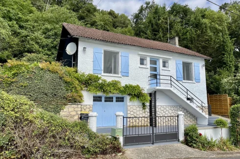With clear elevated views of the Vienne river, no close neighbours and countryside and woodland on the opposite bank - yet close to town - this renovated bungalow comes with a field with a long river frontage, and two garages. It's only a few minutes pleasant walk into the pretty village of Moussac with a nice café/restaurant, and 7km to the town of L'Isle Jourdain (supermarket, bakery, 7 cafés). The spacious and bright main room opens to a rear terrace that faces the garden and woodland, and leads to two double-bedrooms and to a bathroom with walk-in shower and bathtub. Recent double-glazed windows and doors. Central heating, fibre internet.