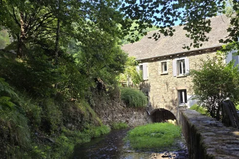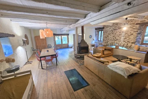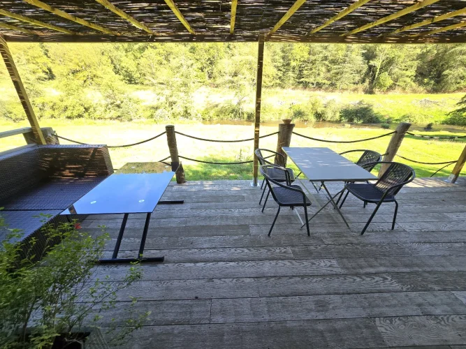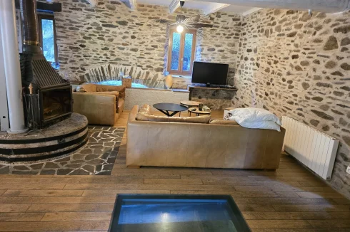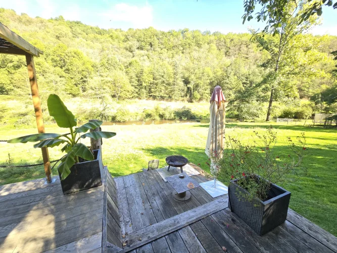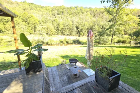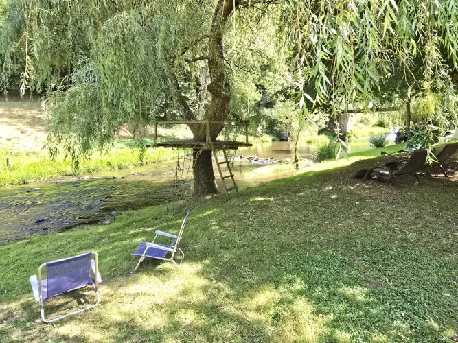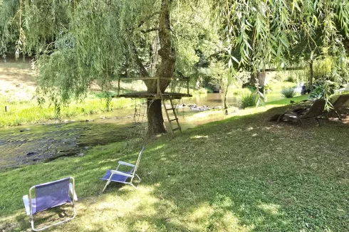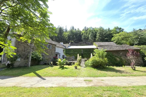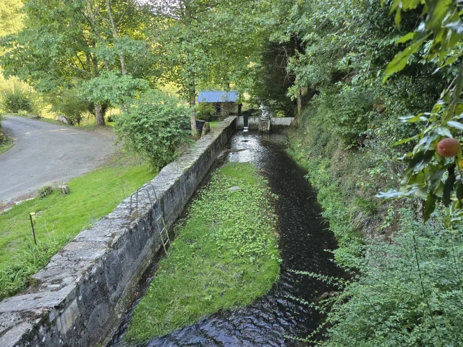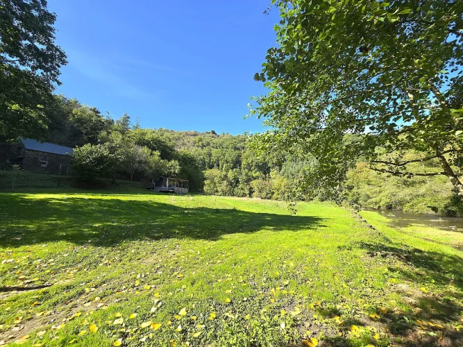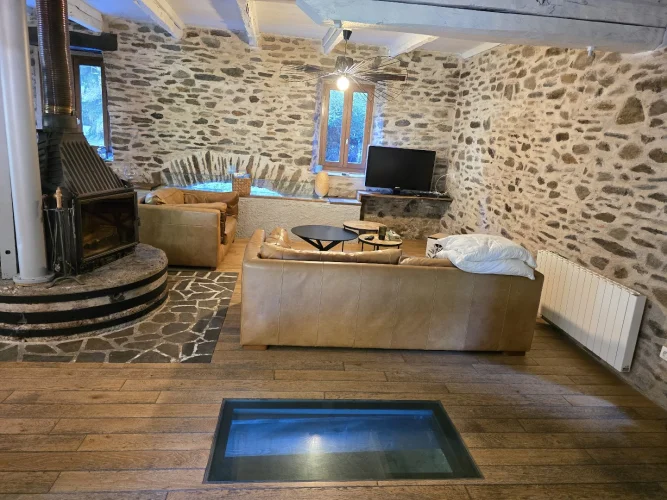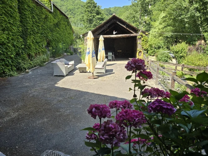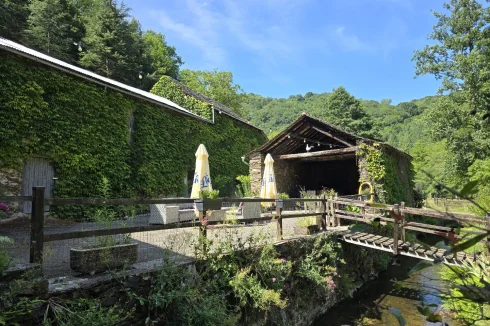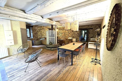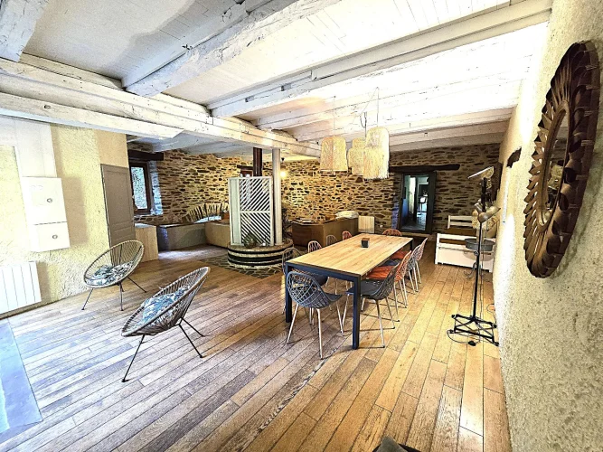 Located in the heart of a valley, quiet and not overlooked, old mill from the 15th century with water rights and a millrace on the river, composed of a house of 200 m², as well as a tiny house as a gite and its 3 barns which could be converted as well as an outbuilding with bread oven. The adjoining complex with 4 Ha of meadows around the property on the edge of the river and its 18 Ha of woods composed of several species such as oak, beech, poplar, Douglas fir, American oak, pine, spruce... The old mill welcomes you with its entrance hall with to its left the large living room/lounge of more than 65 m² with its bay window at the end. In the middle stands a wooden insert which rests on the old millstone. Amidst the beautiful traditional parquet flooring, there's a safety glass panel offering a beautiful view of a vaulted ceiling and the river. At night, spotlights will enchant this view and dazzle your guests. The gentle lapping of the water will lull and soothe you. From the sofa, a second view is offered to you through the arched stone opening, where you can observe the river along its length. At the far end of this room is a bathroom with a toilet. Given the size of the room, some might imagine creating a master bedroom on one level. To the right of the entrance, the dining room with its brand new, equipped open-plan kitchen offers plenty of storage space, and its large central island will allow you to dine around it. Continuing on, carved into the nascent rock, is a superb cellar/pantry for storing provisions and aging your wines. A staircase provides access to the upper floor. In the middle of it, a landing leads you to a shaded country terrace overlooking the stream and offering a beautiful view of the surrounding nature. Upstairs, 4 spacious bedrooms, one of which could be split into two. A room of more than 20 m² can be used as a games room, relaxation room, sports room, dormitory, office... Adjoining it, a small space as a dressing room, storage room, new bathroom or other. To complete this level, a bathroom and a separate toilet. Outside, in front of the entrance, a courtyard bordered by 2 barns and opposite another stone building which houses a super functional bread oven. The barns will allow you to tinker, store firewood, shelter your vehicles, cars, tractor, quad, camper, boat... and if you have more ambitions you can set up cottages or guest rooms. Not far away, a tiny house with all mod cons with a living room with its equipped kitchen, a bedroom and a bathroom with toilet. At the front, a large covered terrace with a more cozy half-level around a fire pit. At the back, a third barn, perhaps for another project around well-being and relaxation or an artist's studio? The water and electricity supplies have been anticipated!