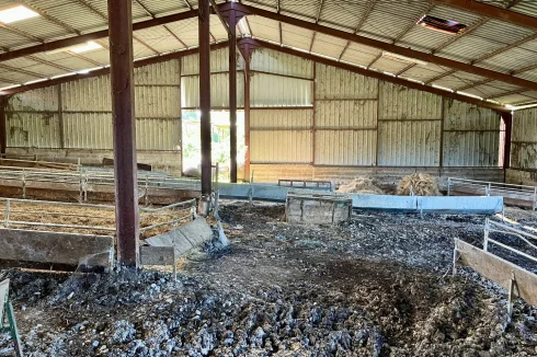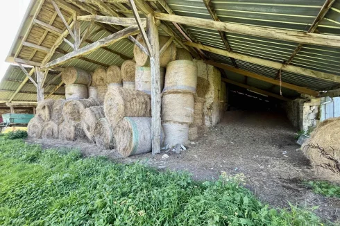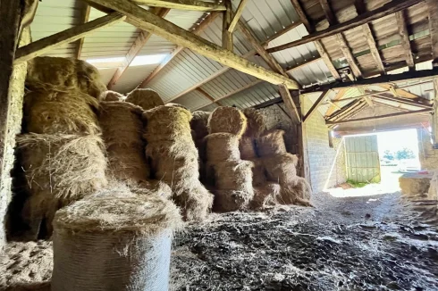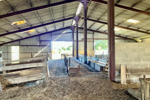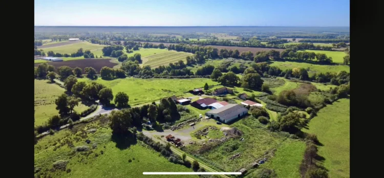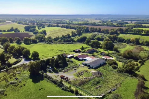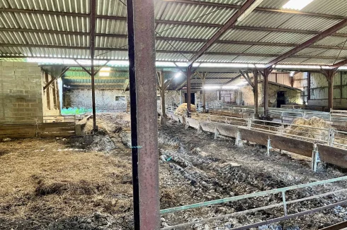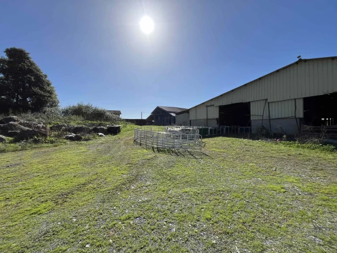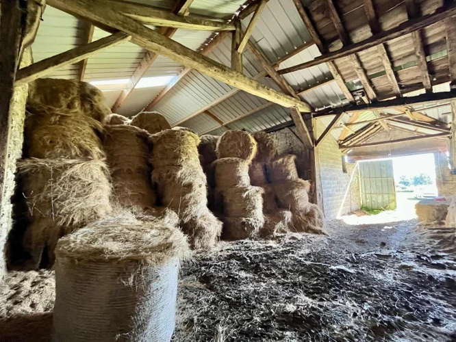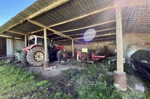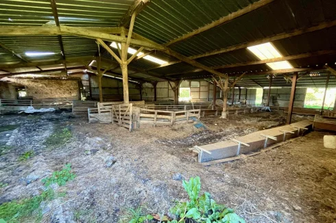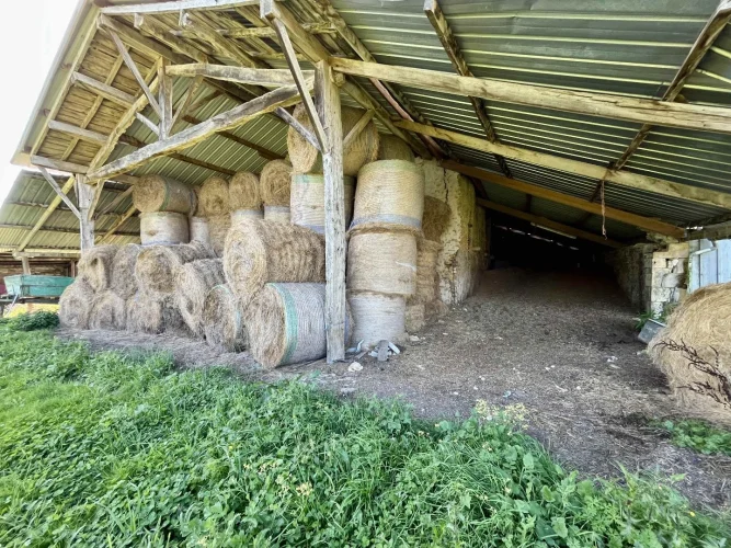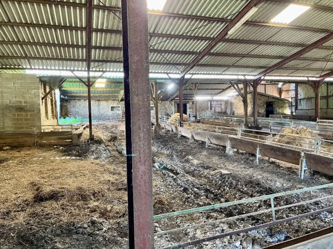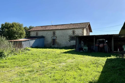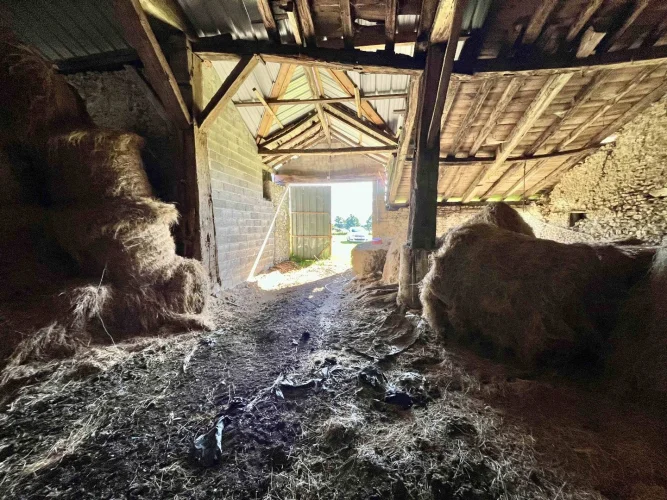 The property has 92 hectares, all connected, the land is pasture, quite flat. Wind turbines at 960 metres (next to the land, but not a part of it). The two-bedroom house (see the floorplan) is 88m2 - all ground floor - you could convert the upstairs (attic) for the same again. The front half of the house roof was replaced in 2010, the back half was repaired/checked in 2009. The house is lived in but needs complete renovation. The barn is 400m2, roof replaced in 2019, and the huge sheep barn is 1200m2 (built 1991, cement-asbestos roof) they are next to each other. There is a neighbour house close-by (quiet and friendly), that's 50 metres from the house but it's not seen from the house windows (it's off to the side). No passing traffic in front of the house - the lane ends there at the house and neighbour's, it connects to a quiet lane (that is flat so easy by bike) that goes into Pressac village. The village of Pressac has a café/restaurant, a pizza restaurant, and a steak restaurant. The café has fuel. There is also a garage for car repairs. Just outside the village is a quality restaurant on a lake. The town of Confolens with supermarkets etc is 14km / 14 minutes a straight fast road.