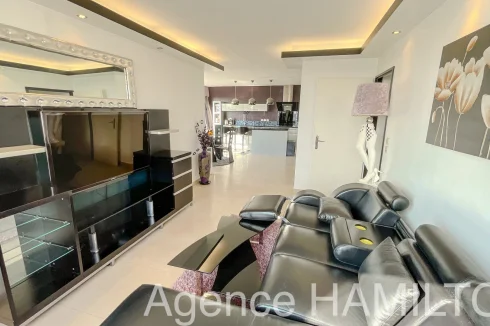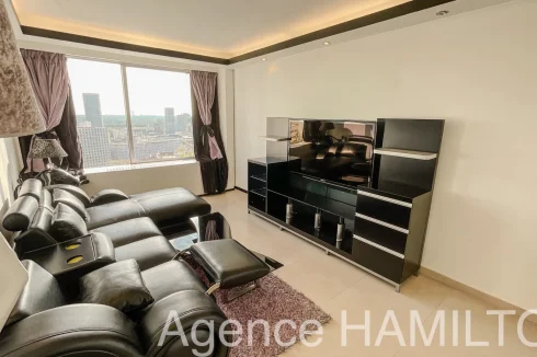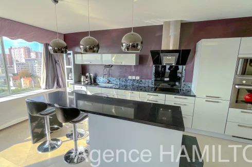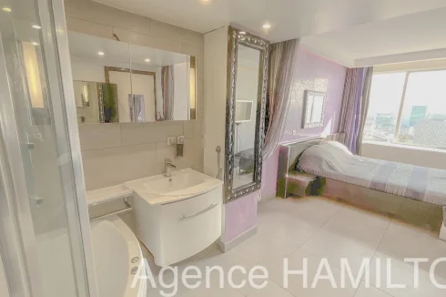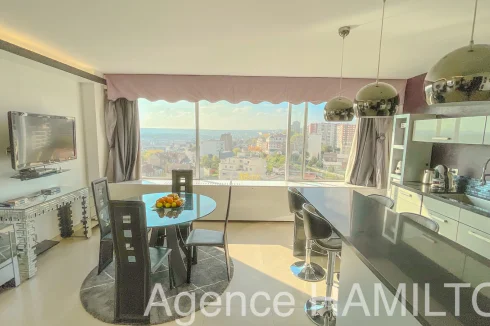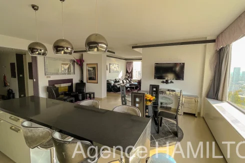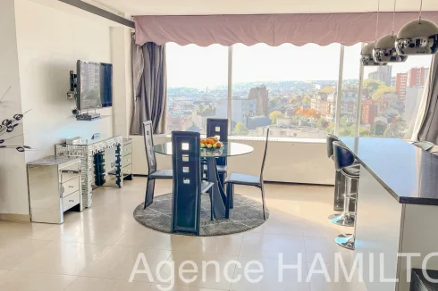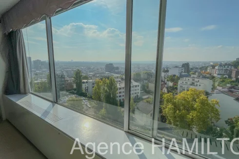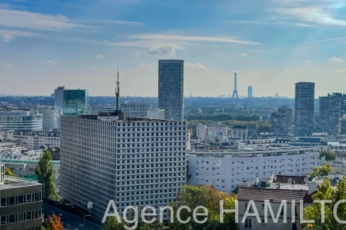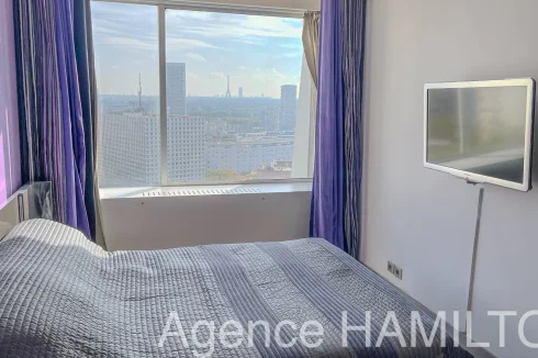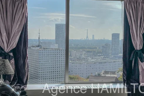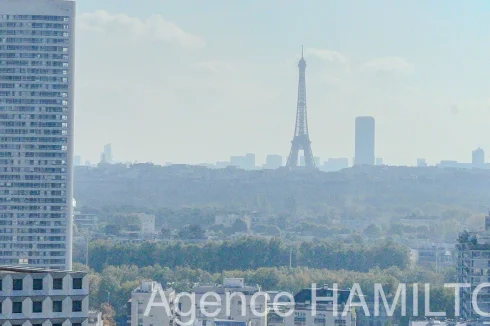 I offer you this sublime apartment entirely renovated on the 10th floor with a breathtaking view of Paris and the Eiffel Tower. It consists of an entrance opening onto a double living room (3rd bedroom possible) with high-end American kitchen (Italian granite console, porcelain floor, built-in furniture, high-end household appliances...), a bathroom and a separate toilet, 2 bedrooms including a master bedroom with jacuzzi overlooking the Eiffel Tower. The apartment has a cellar and a parking space in the basement. Very nice amenities, possibility of keeping the furniture.