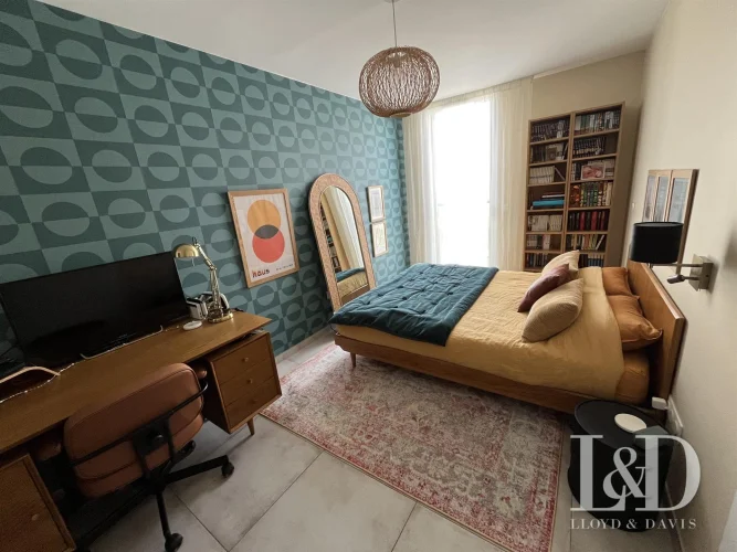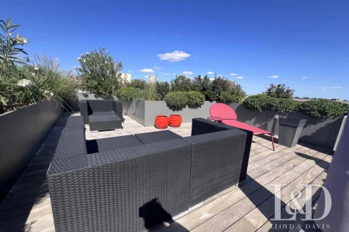 In a recent secure residence, connected with the historic center of Montpellier by the tramway, I offer you a superb T4 apartment on the top floor, offering comfortable volumes and very nice services. The living space totals 119 m². An entrance hall equipped with a large fitted cupboard opens onto an elegant living room-kitchen of 46 m² very bright. It communicates with a first terrace of 18 m² preserving privacy thanks to large planters. The kitchen offers high-end equipment. The parental space of 22 m² includes a beautiful bedroom, a custom-made dressing room and a bathroom with window and suspended toilet. In the night area there is a laundry room, a second toilet, a bathroom and two other bedrooms equipped with custom-made dressing rooms. The laundry room offers plenty of storage, as well as the large bathroom with a bathtub. An interior patio gives access to the 70 m² rooftop terrace with panoramic views and without vis-à-vis.