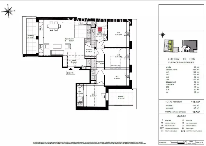 This brand-new 4-bedroom apartment (113 m²) is located on the fifth floor. Dual-Aspect and bathed in natural light, it offers a direct west-facing view of the Sacré-Cœur from its terrace — the perfect spot to enjoy magnificent Parisian sunsets.