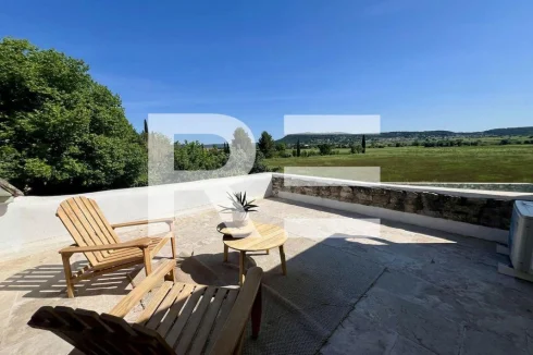 - Two adjoining rooms, one of which has a fireplace and mezzanine, opening onto a large terrace with a view of the countryside and the Oppidum of Nages-et-Solorgues.