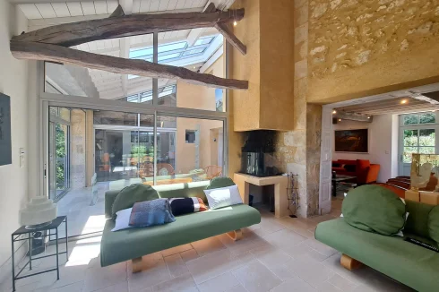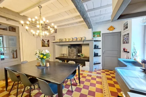 The kitchen is both functional and elegant, fitted with Sagne cabinetry and high-end appliances: a Lesure gas range cooker, large American-style fridge, microwave, two ovens, and Siemens dishwasher. The bright dining room opens directly onto the garden through French doors. The warm and luminous living room features a wood-burning stove, perfect for winter evenings.